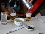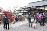 さてさて、走ったし、遊んだし写真も取ったので、そろそろ引き返します。途中、神社の麓のおみやげ屋さんを見るとハイカーで一杯でした~。みんなで一緒に一休みしたいけど無理かなぁ・・・と思っていたところ、ワンコもOKよ!と言ってくれた茶屋「宝亭本店」にて一休みすることが出来ました。なかなか多人数だと難しいのですが、今回はコンパクトツアーで少人数だったので、ラッキー!!疲れた身体をしばし温めプルプルと主張するふくらはぎや太ももをトントン叩きながら、ビールやらお汁粉やらをいただきました。酒がしみる、糖分が、塩分がお腹に染み渡るぅ~♪
