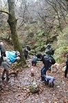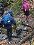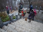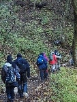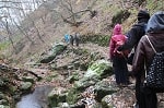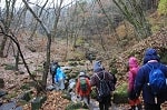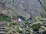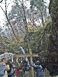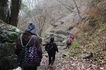 昼食後、雪は一向にやむ気配が無く・・・しかし、身体は冷えてきたのでロックガーデンに向かって出発することに決定。冬の山(低山でも)では、いかなる天気でも雨具と防寒対策は必須ですね!今回身を持って実感いたしました。みるみるうちに道と岩に雪が積もる中、準備を整えて再出発。皆様足元に気を付けながらそろそろと慎重に進み綾広の滝に到着~。雪が降る滝と渓谷も何か神秘的な雰囲気でした。なかなか味わえない光景だとポジティブに考えるスタッフでした。その後は途中の東屋まで一気に慎重に渓谷を下りトイレ休憩を取ってまた出発です。渓谷が終わりに近づくとあれ?雪が止み日が差してきました。