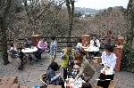 しばらく山の中を歩き、前回の遠足でも立ち寄った、天空のテラス「樹ガーデン」へとまいります!比較的時間が早かったこともあり、全員入れるだけの席が空いていたので、ここでしばし休憩です。