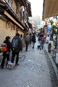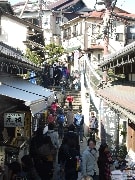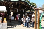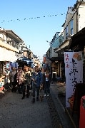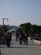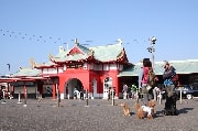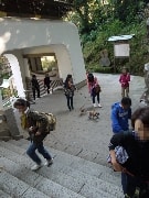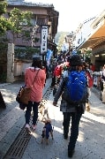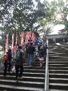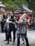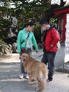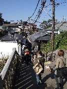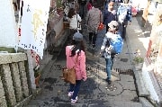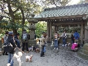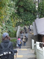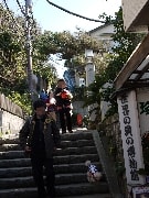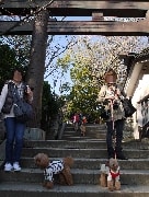 江ノ島アイランドスパのテラスから、青銅の鳥居をくぐって弁財天仲見世通りを登っていきます。天気が良かったので、結構人が出てましたね~。いきなりお饅頭やらお団子やらの誘惑をぐっと堪えて進みます~。ここ近年人気のタコせんべい屋さんの行列を横目に進んでいくと江ノ島神社(辺津宮)への階段が現れます。毎回、ワンコは元気一杯登っていきますね~。実はこの江ノ島神社、日本三大弁天に数えられています。江戸時代までは弁財天を祀っていて、江島弁天・江島明神と呼ばれていたそうです。江戸時代は平和だったので戦勝祈願などはなく、信仰半分、娯楽半分で大山~江ノ島~鎌倉と旅行するのが流行っていたみたいですね。今行ってみても楽しそうなコースです。江戸時代に人気だったコースをワンコと歩くのも何か不思議な感じで面白いですね~。