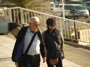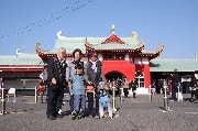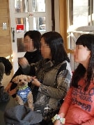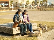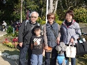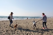 風も強くなく、日差しも暖かく絶好の遠足日和です。遠くに富士山がうっすら姿を見せてくれました。きらきら光る海を眺めながらワンコとのんびり歩いていきます。1回目の集合ポイントは江ノ島アイランドスパのテラスです。全員で記念写真を撮りまーす!