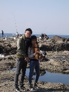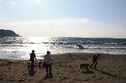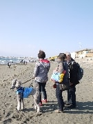 皆さん満腹さんで、広場に集合~。下山開始後、仲見世通りでちょっとお土産タイムを取ってそのまま片瀬海岸に到着~。既に日が傾いてきて、海がキラキラしていてキレイでしたね~。浜辺の自由時間!駆け回ったり、ゴロゴロしたり、海にビビったり、写真を撮ったり、風に吹かれながら皆様思い思いに楽しんでました。