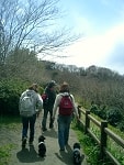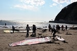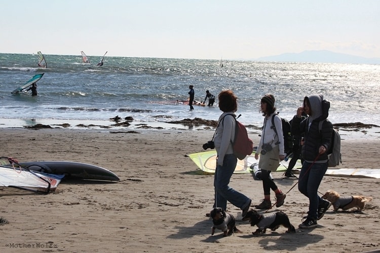 披露山公園に着くと、富士山と江ノ島がくっきり、反対側には葉山の海岸が一望できます。ここで一旦、自由時間です。小さな動物園があるので猿山を見たり、展望台で写真を撮ったり。。。まだ先がありますので水分補給も十分にしておいてくださいね~。次は逗子海岸を目指して出発!これまた山道を降りていきます。足元が滑りやすいので要注意です。海岸沿いの道路に出る前の広場で、2回目の集合写真です。結構風邪が強かったですね。逗子海岸はウィンドサーファーがたくさん。気持ちよさそうに海を滑るサーファーさん達を見ながら海岸をお散歩です。潮の匂いと風が心地よいですね~。