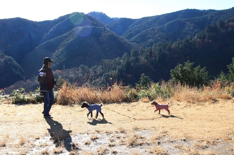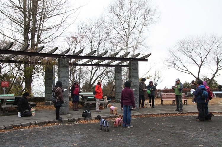 長尾平に着いて自由時間です。茶屋でホットワイン、ビールなど、車を運転しない方はどーぞ一杯やってくだされ~。見晴らし台まで歩いていくと雪が降った後だけに空気が冷たく透き通っていて、遠くの山々や、都心のビル郡までよく見えました~。芝生の広場で暫らく暖かい日の光を浴びながらワンコと遊びましょう。休憩でーす!走る犬、くわえる犬、寝る犬・・・まぁ、色々。