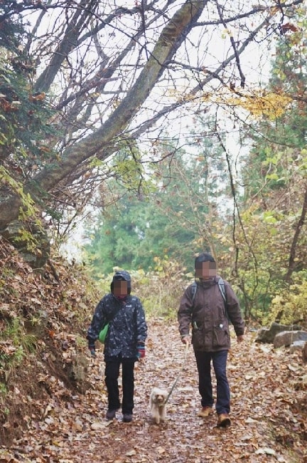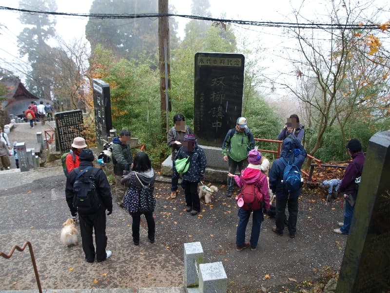参加のお客様を待つ間、モワ~と濃い霧が立ち込め、本来駅前広場から見えるはずの景色も全く見えず、真っ白な牛乳?あるいはにごり酒?の中にいるようです。「雨だけは降らないでね」と祈るスタッフでした。霧でお客様のお顔が確認しにくかったのですが・・・皆様次々と集合!コースは武蔵御嶽神社~ロックガーデン~長尾平と前回の2008年遠足と同じコースを歩きます。今回の初参加は、トイプードルのココちゃん、ミニチュアダックスのマコちゃんでした!そして遠足ベテランのトイプードルのマロン君、常連さんのMシュナウザーのソイ君とその妹分トイプードルのカリンちゃん、2代目を継いだポメラニャンの小太郎君を加えスタッフ含め総勢12名9頭にて、いざしゅっぱーつ!MWイベント史上に残る波乱万丈な遠足の始まり始まり~・・・