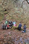 昼食後、雪は一向にやむ気配が無く・・・しかし、身体は冷えてきたのでロックガーデンに向かって出発することに決定。冬の山(低山でも)では、いかなる天気でも雨具と防寒対策は必須ですね!今回身を持って実感いたしました。みるみるうちに道と岩に雪が積もる中、準備を整えて再出発。皆様足元に気を付けながらそろそろと慎重に進み綾広の滝に到着~。雪が降る滝と渓谷も何か神秘的な雰囲気でした。なかなか味わえない光景だとポジティブに考えるスタッフでした。その後は途中の東屋まで一気に慎重に渓谷を下りトイレ休憩を取ってまた出発です。渓谷が終わりに近づくとあれ?雪が止み日が差してきました。