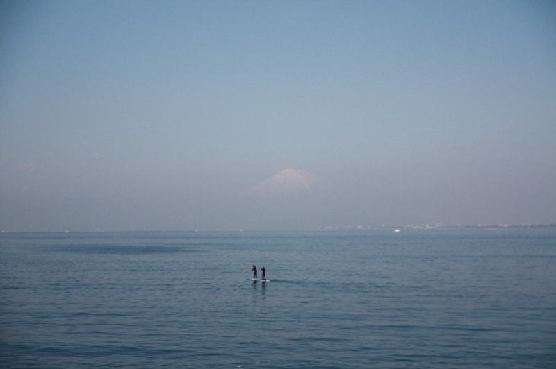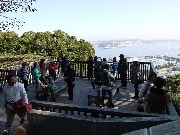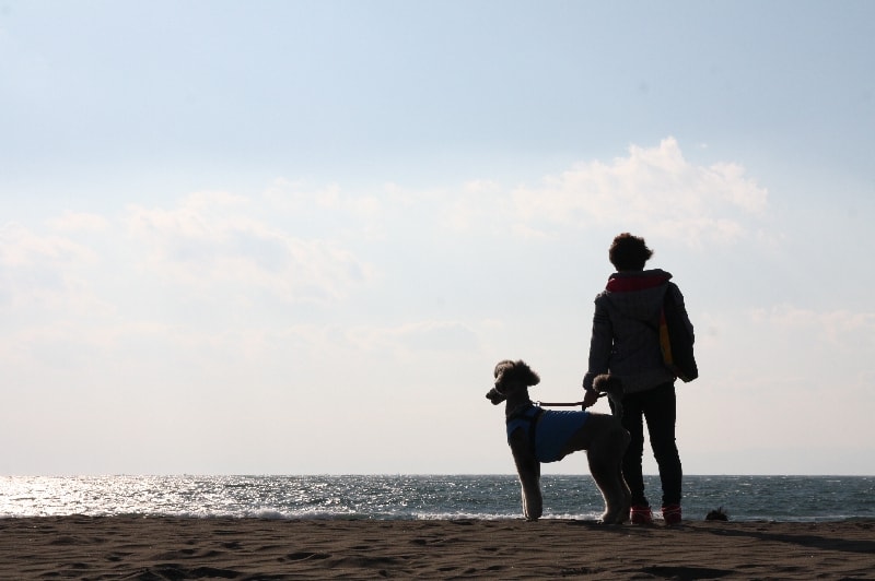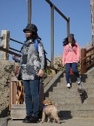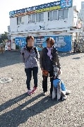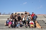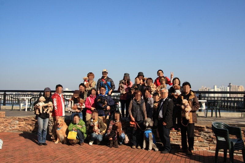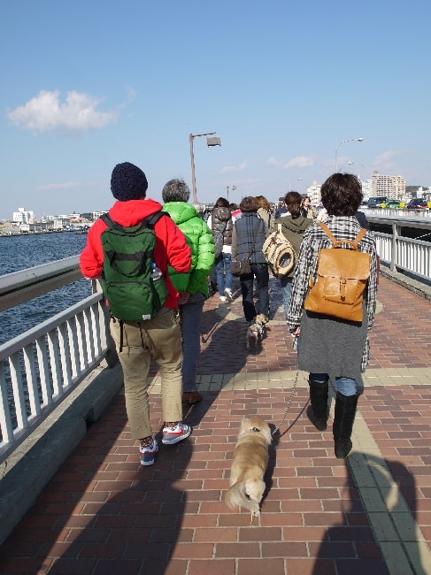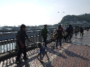風も強くなく、日差しも暖かく絶好の遠足日和です。遠くに富士山がうっすら姿を見せてくれました。きらきら光る海を眺めながらワンコとのんびり歩いていきます。1回目の集合ポイントは江ノ島アイランドスパのテラスです。全員で記念写真を撮りまーす!