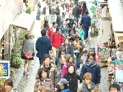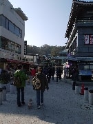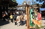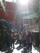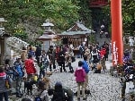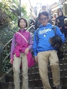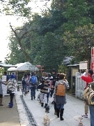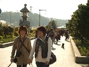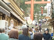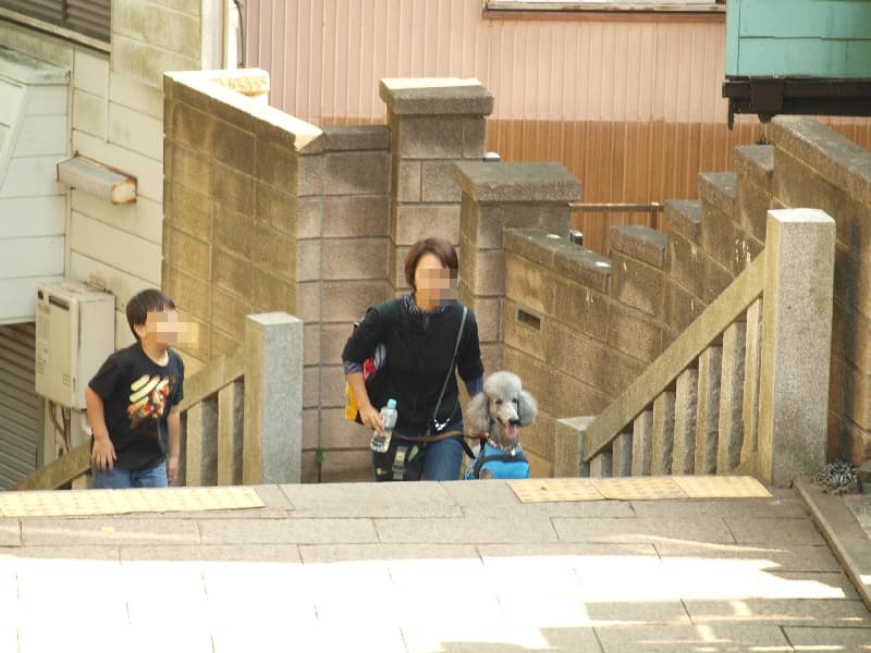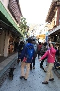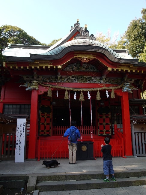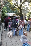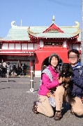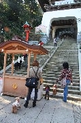 江ノ島アイランドスパのテラスから、青銅の鳥居をくぐって弁財天仲見世通りを登っていきます。天気が良かったので、結構人が出てましたね~。いきなりお饅頭やらお団子やらの誘惑をぐっと堪えて進みます~。ここ近年人気のタコせんべい屋さんの行列を横目に進んでいくと江ノ島神社(辺津宮)への階段が現れます。毎回、ワンコは元気一杯登っていきますね~。実はこの江ノ島神社、日本三大弁天に数えられています。江戸時代までは弁財天を祀っていて、江島弁天・江島明神と呼ばれていたそうです。江戸時代は平和だったので戦勝祈願などはなく、信仰半分、娯楽半分で大山~江ノ島~鎌倉と旅行するのが流行っていたみたいですね。今行ってみても楽しそうなコースです。江戸時代に人気だったコースをワンコと歩くのも何か不思議な感じで面白いですね~。
