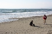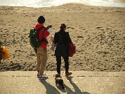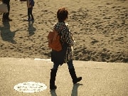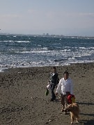 皆さん満腹さんで、広場に集合~。下山開始後、仲見世通りでちょっとお土産タイムを取ってそのまま片瀬海岸に到着~。既に日が傾いてきて、海がキラキラしていてキレイでしたね~。浜辺の自由時間!駆け回ったり、ゴロゴロしたり、海にビビったり、写真を撮ったり、風に吹かれながら皆様思い思いに楽しんでました。