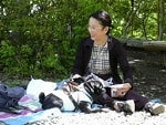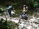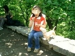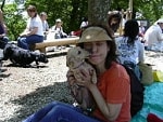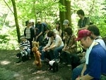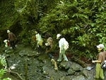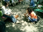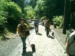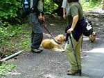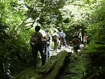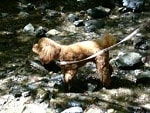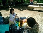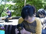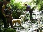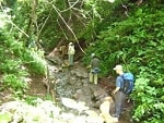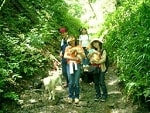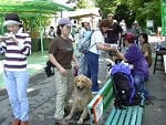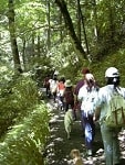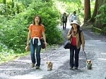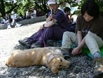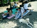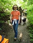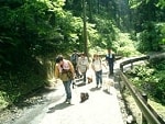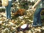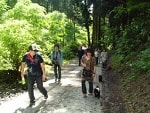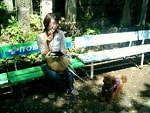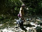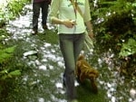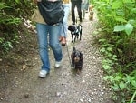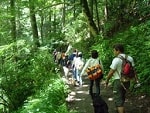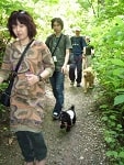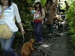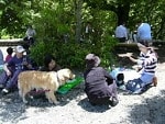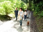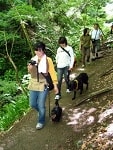 さて、腹も膨れたし、おしゃべりも楽しんだし、人もわんさか上がってきたのでそろそろ山頂を出発。山頂の記念写真を撮った後、思い切って6号路で下山です。6号路は渓流沿いに下っていく道で結構道幅が狭かったりするのできちんと脚側につけて歩く必要がありますね。すれちがうハイカー達に「こんにちはー!」と声をかけながら、気分良く下っていきます。渓流のせせらぎをBGMに時折ひんやりした空気に触れて気持ちよかったですね。途中休憩の時には小川にみんな降りてワンコに水遊びをさせてあげたり。。はしゃいでるコもいましたが、まっ楽しい遠足って事で。他のハイカー達には一切迷惑をかけませんでしたもんね!卒業生の皆様の日頃の教育の成果を見せてもらいました!