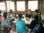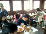 「やっと着いた~」八幡宮からのこの道のりは、UP&DOWNの無い平坦な道だったんですが、朝からの疲れが溜まっていて皆結構へとへとになっていましたね~。海の見える個室?に15名。やっと座れたー!。ビールやらピザやらドライカレー等、食べたいものを思い思いにオーダーして話に花を咲かせ楽しいひととき。皆疲れを癒しました。オーダーを取りに来るおねえさんは犬が多いのでちょっとびっくりしていましたがね。。。(笑)