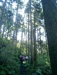 鶴岡八幡宮の東門を出て杉本寺方面に向かいます。いつもの鎌倉天園遠足の帰りコースの逆を歩きます。途中、鎌倉情緒あふれる民家の間を通りつつ、大通りに沿って歩いていきます。杉本寺の入口前の信号を向かいに渡って一度集合。ここから少し住宅地を通り衣張山へ登ります。少し歩いて暑くなってきました~。川沿いに歩くと気分が良いですね~。ちょっとした住宅街の坂を登っていくと、衣張山を登る入口に到着。入口に平成巡礼道の表記があって、ここから登りの開始~。山にはシダ類が茂っていて晴れの日でもちょっと空気が湿っている感じの道です。さて15分程度の登りですが、頑張っていきましょう~。頂上で富士山が見えるといいですね~。