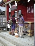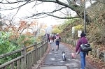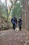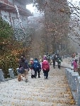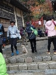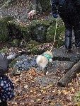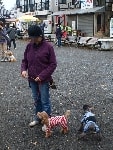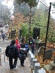 出発時は霧も晴れていたので、気を取り直していざ武蔵御嶽神社へ!遠くの景色は拝めませんでしたが、綺麗に紅葉した木々を見ながら参道を進みます。宿坊が立ち並ぶ天空の町並みを抜け、キツイ坂を上がっていくとおみやげ屋さんの並ぶ武蔵御岳神社の麓に到着!ここまで登るだけでも傾斜がキツく、ふくらはぎがプルプルしていました~。ちょっと息を切らせている人間を横目にワンコは皆元気にルンルン進みます。そんでこっからがまた・・・神様へと続く地獄の階段なのである(汗)!!皆様、マイペースで登ってくだされ~。武蔵御嶽神社の境内に到着し一旦休憩&自由時間です~(このあたりから何やら雲行きが怪しげ・・・)。各々お参りをしたり、奥に祭られている「お犬様」を見学に行ったり、思い思いに探索を済ませて一旦集合。次の目的地ロックガーデンを目指します。