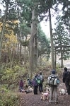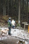 暫らく歩いて長尾平の分岐点に到着。一旦このまま進むかどうか皆様に意見をお伺いしましたが・・・「折角なので行きましょう!」という元気なお返事にひと安心&感謝しつつ、パラパラ霰が降る中、綾広の滝を目指して再出発。幸い雨ではないので濡れることはなさそうだったので良かったです。途中、「天狗の腰掛け杉」を見学しながら少しずつ下っていく山道を進む探検隊。うん探検隊っぽかった。綾広の滝に降りる前の東屋で一旦休憩です。この頃から霰が雪に変わり・・・再び進むべきかどうか迷いましたが、このままちょっと早めの昼食とあいなりました。他の登山者がワンコがたくさんいてちょっとびっくりしてましたね。休憩中、雪が激しく降ってきて、この先ど~なることやら・・・とお空とにらめっこ。。。山の天気は難しいですね~。とりあえず持参のおいしいお弁当を楽しみましょう!
