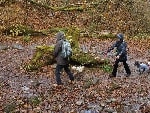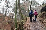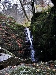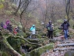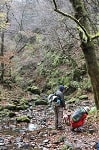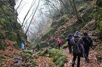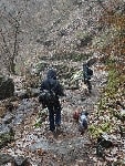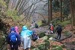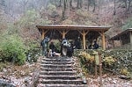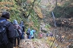 昼食後、雪は一向にやむ気配が無く・・・しかし、身体は冷えてきたのでロックガーデンに向かって出発することに決定。冬の山(低山でも)では、いかなる天気でも雨具と防寒対策は必須ですね!今回身を持って実感いたしました。みるみるうちに道と岩に雪が積もる中、準備を整えて再出発。皆様足元に気を付けながらそろそろと慎重に進み綾広の滝に到着~。雪が降る滝と渓谷も何か神秘的な雰囲気でした。なかなか味わえない光景だとポジティブに考えるスタッフでした。その後は途中の東屋まで一気に慎重に渓谷を下りトイレ休憩を取ってまた出発です。渓谷が終わりに近づくとあれ?雪が止み日が差してきました。